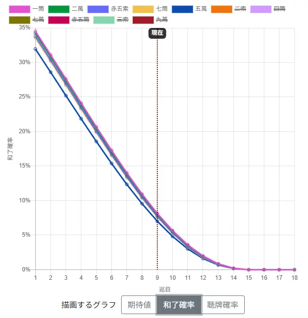 多くのツールは「有効牌の枚数」のみを表示しますが、麻雀の勝利条件は「アガること」そして「点棒を稼ぐこと」です。このシミュレーターは、巡目ごとの「期待値(局収支)」と「和了確率」をグラフ化してくれます。 「枚数はAの方が多いが、期待値はドラ受けのあるBの方が高い」といった、上級者が脳内で行っている高度な判断を、明確な数値として可視化できるのが最大の特徴です。