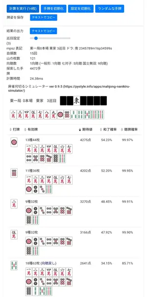 たったこれだけで、膨大なパターンをシミュレーションし、最適な打牌候補をリストアップしてくれます。「シミュレーション実行」の回数を増やすことで、より精度の高い結果を得ることも可能です。
