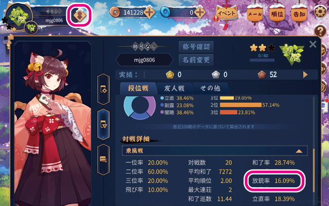 対局データの振り返り:自分の「放銃率」と「和了率」をチェック