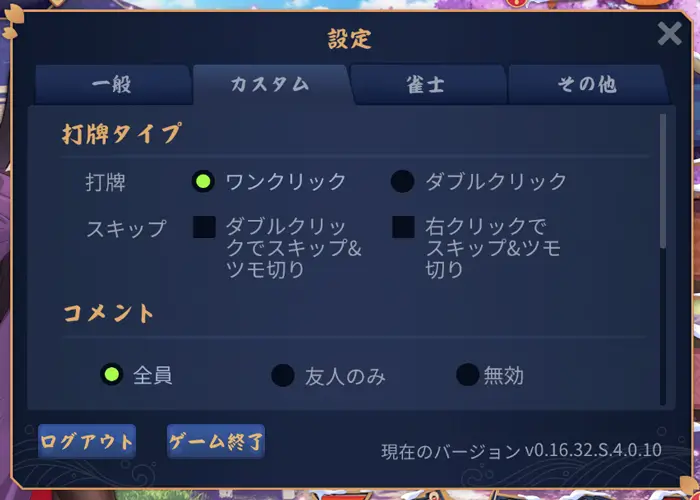 - サウンド: BGMを少し下げ、効果音(打牌音や発声)を聞こえやすくすることで、リズムよく打てるようになります。