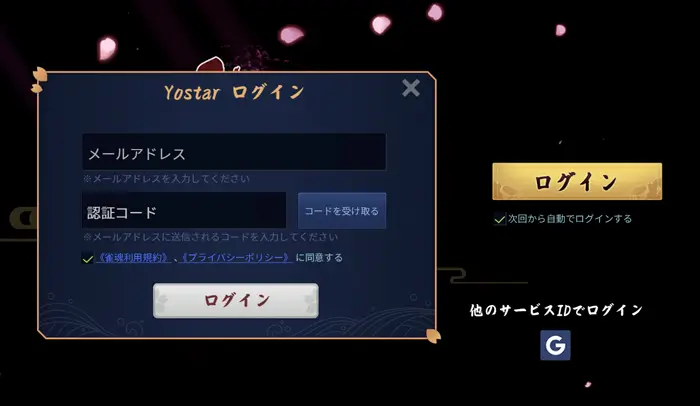 - ログイン画面が表示されるので、(スマホ版で使用している)メールアドレス(Yostar ID)を入力し、送られてくる認証コードを入力すれば完了です。