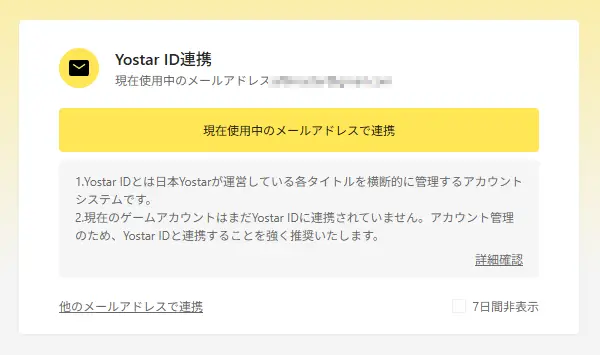 3)ログインに成功したら、Yostar IDの連携をもとめられるので、
