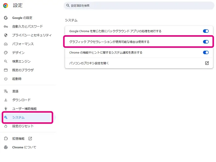 - ハードウェアアクセラレーションをONにする: ブラウザの設定画面から「システム」を開き、ハードウェアアクセラレーションが有効になっているか確認してください。