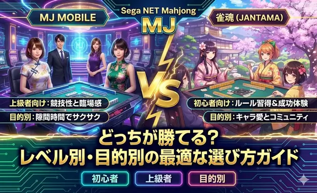 2026年現在、スマホやPCで手軽に遊べるオンライン麻雀ゲームは数多くありますが、中でも圧倒的な人気を誇るのが「MJモバイル(セガNET麻雀 MJ)」と「雀魂(じゃんたま)」です。これから麻雀を始めたい初心者の方や、どちらのアプリに移行しようか迷っている方にとって、「結局どっちが自分に合っているの?」という疑問は尽きませんよね。 本記事では、長年麻雀ゲームをプレイし、ブログでも発信してきた視点から、両アプリの決定的な違い、それぞれの強みや弱み、そして2026年の最新トレンドを踏まえた最適な選び方を徹底比較して解説します。この記事を読めば、あなたのライフスタイルやプレイスタイルにぴったりの麻雀アプリが必ず見つかるはずです。